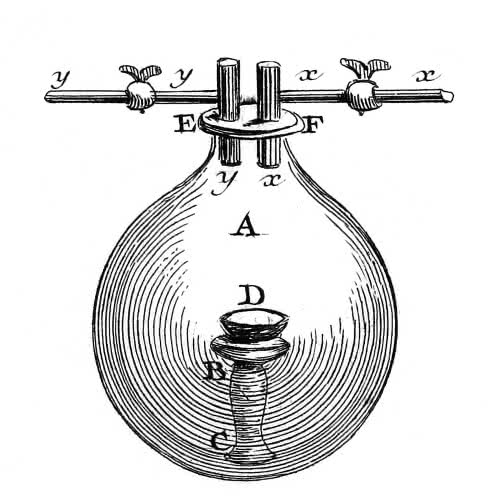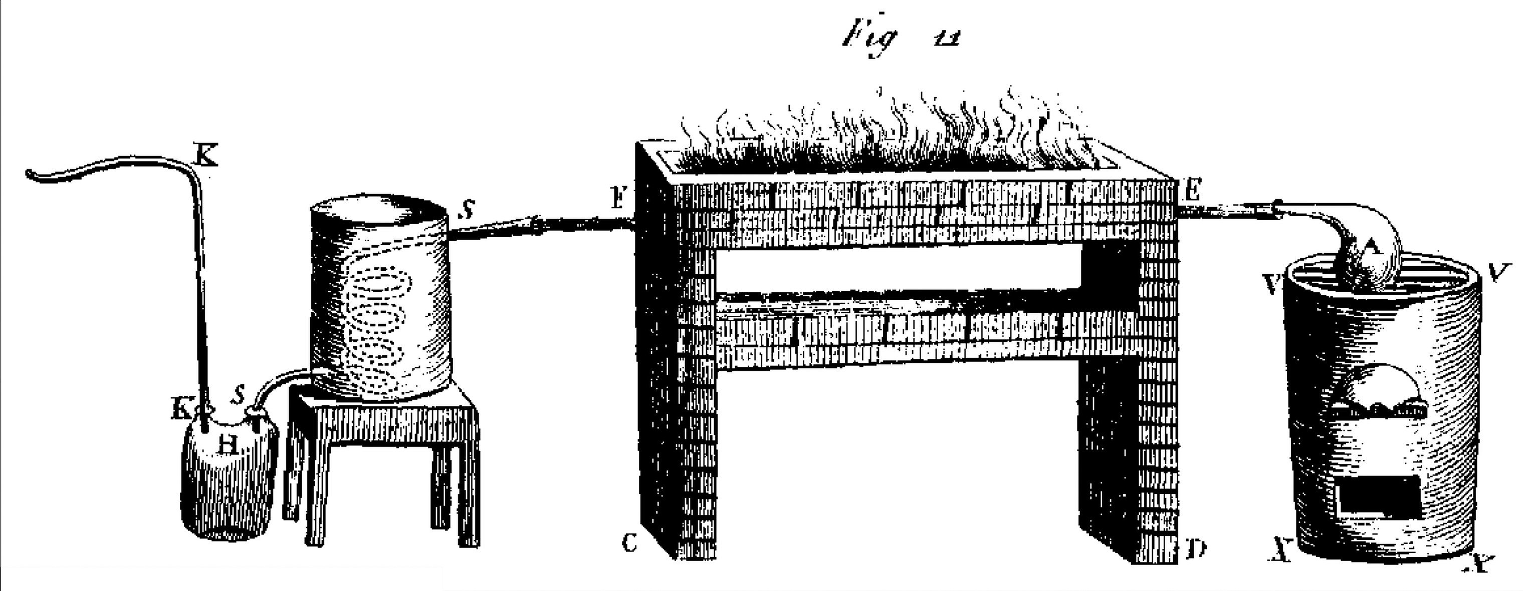 powstający wodór uchodzi przez rurkę K (szkic z roku 1789)