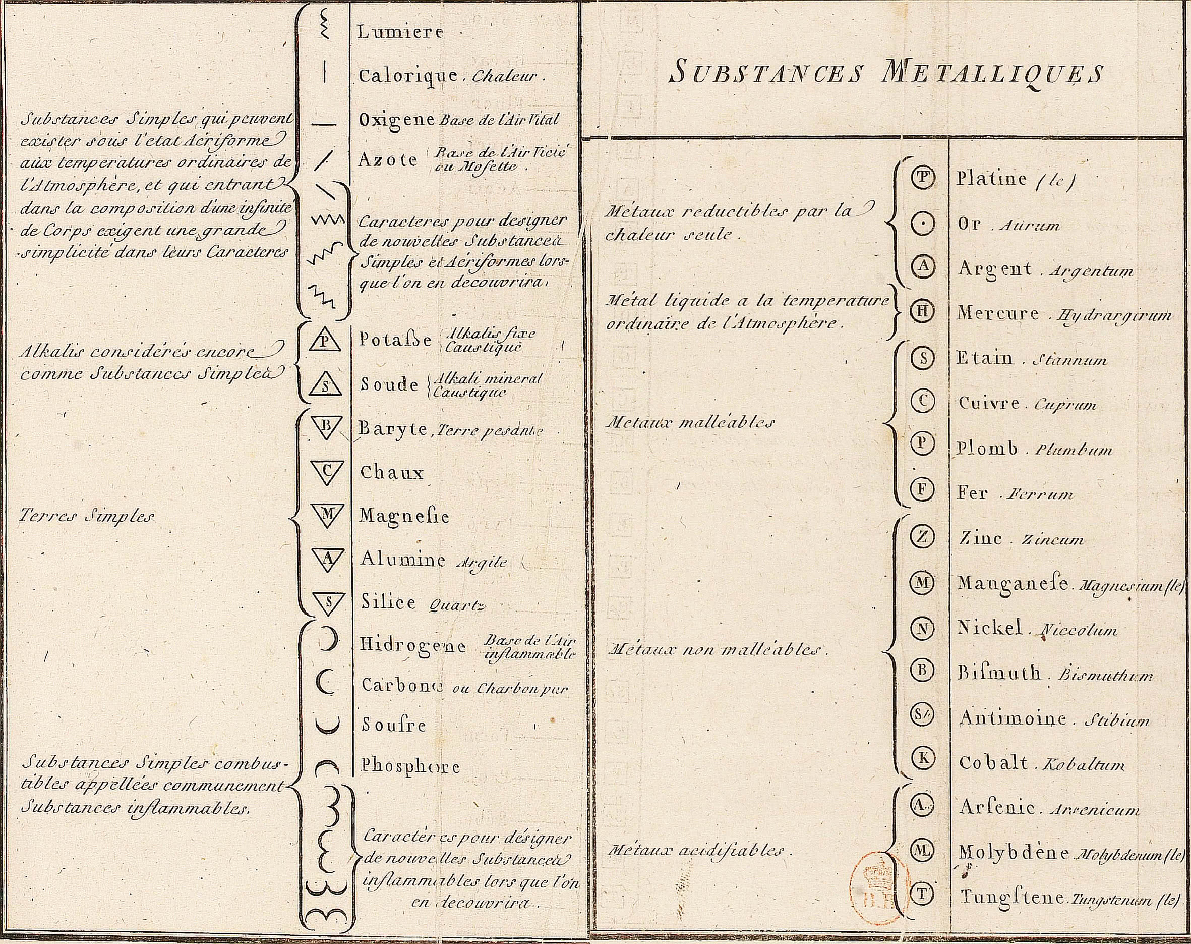 Na liście znalazło się 17 znanych wtedy metali, kilka niemetali oraz ziemie, których nie umiano jeszcze rozłożyć na składniki (wapno CaO, magnezja MgO, baryta BaO i krzemionka SiO2). Sam Lavoisier przypuszczał, że są one substancjami złożonymi, podobnie jak soda (węglan sodu) czy też potaż (węglan potasu).