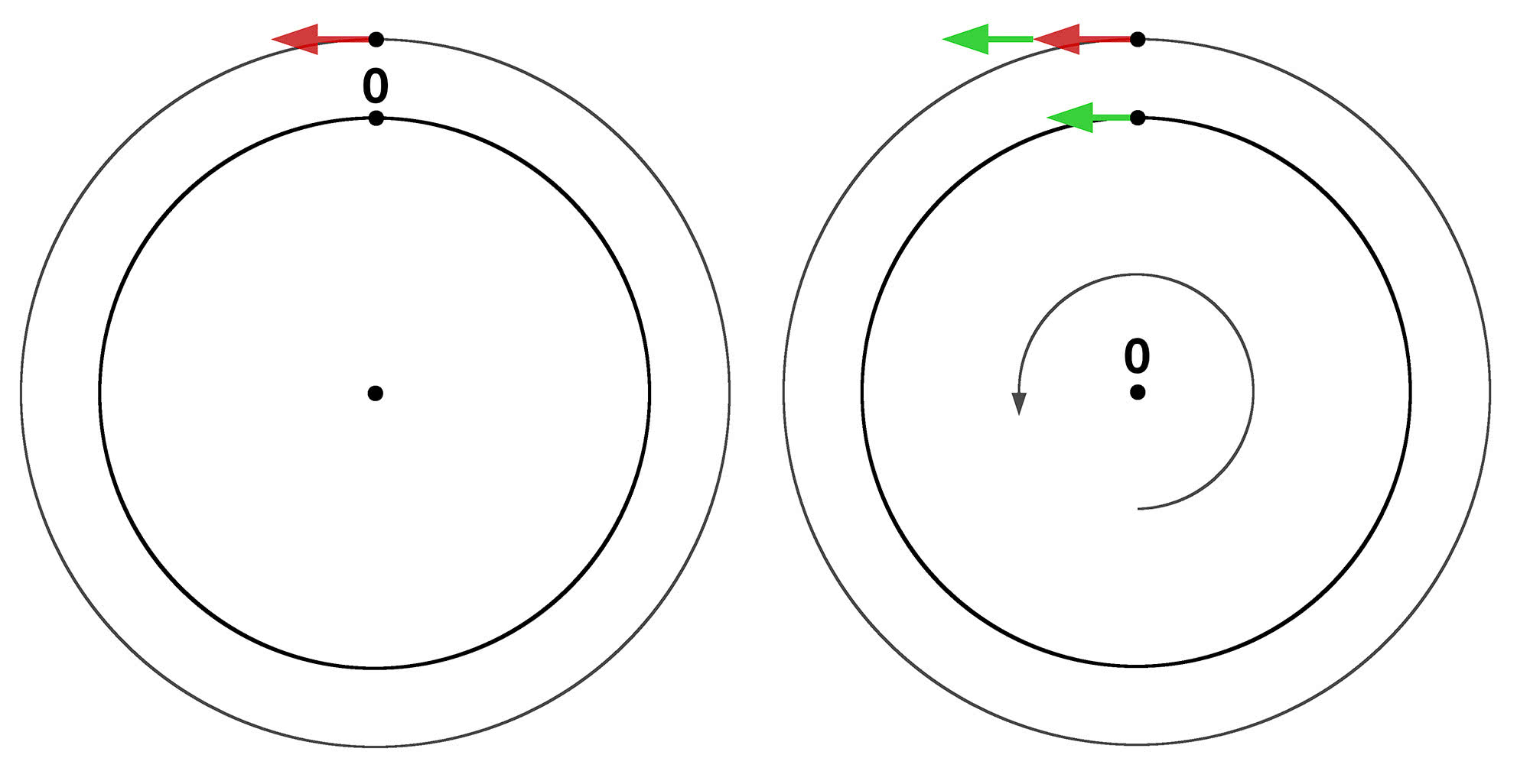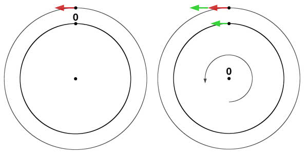 z nieruchomym środkiem Ziemi prędkość ta sumuje się wektorowo z prędkością