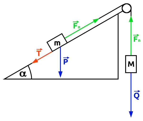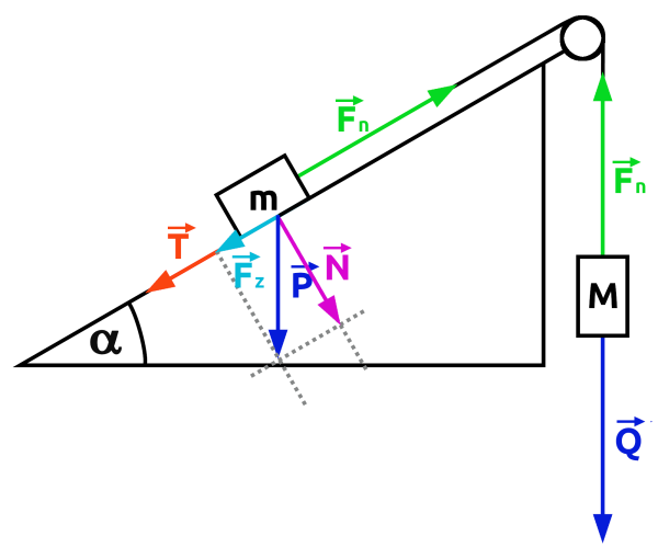 Zatrzymajmy się na moment przy ważnej informacji podanej w zadaniu: ciała są połączone nierozciągliwą linką. Wynika z tego, że skoro ciało o masie m porusza się do góry po równi ze stałą prędkością, to z prędkością o tej samej wartości ciało o masie M porusza się w dół. To kolejna rzecz łatwa do przeoczenia w przypadku rozbudowanej treści. W następnym kroku zauważamy, że siły działające na każde z ciał muszą się równoważyć, skoro poruszają się one ruchem jednostajnym. Wynika to z pierwszej zasady dynamiki. Bez trudu dochodzimy do wniosku, że naciąg linki jest co do wartości równy ciężarowi ciała o masie M, czyli Fn=Q=Mg. Co jednak zrobić z siłami działającymi na drugie z tych ciał?