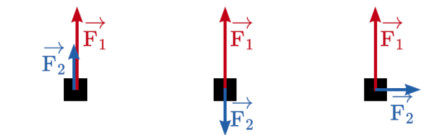 Zupełnie inaczej wygląda sytuacja, jeśli mamy do czynienia z wielkościami wektorowymi. W tym przypadku zachowanie układu fizycznego zależy od kierunku, zwrotu i wartości działającej siły wypadkowej. Na rysunku 1 przedstawiono ciało, na które równocześnie działają dwie siły o wartościach i , przy czym w każdym z zaprezentowanych przykładów siły te są względem siebie ustawione pod innym kątem.