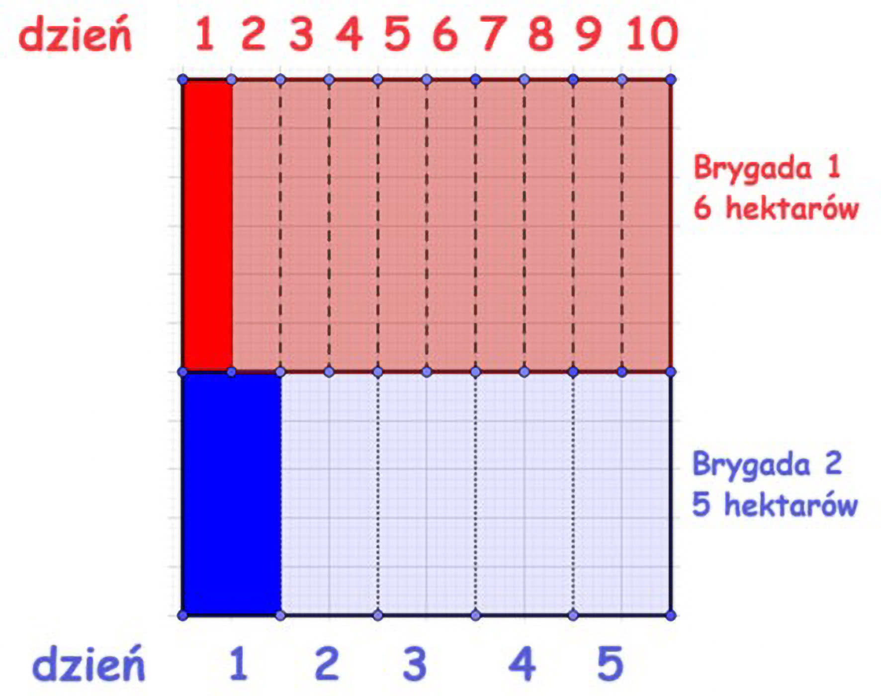 Teraz do zadania. Odpowiedni układ równań nie jest trudny i dochodzimy do podanego w zbiorku rozwiązania: pierwsza brygada „pełła i przerywała” 0,6 ha dziennie, druga 0,4. Pierwsza pracowała 10 dni, druga 5. Mam wątpliwości co do podanej w książce odpowiedzi o zarobkach (64 zł). Jest mało prawdopodobne, żeby dniówka obrachunkowa wynosiła 32 zł na całą brygadę 10-osobową, a więc 3 zł 20 groszy za dzień pracy. Masło kosztowało wtedy 17,50 (za kostkę), za 20 zł można było zjeść obiad w restauracji, a jajka były po 1,50…2 zł. Jeżeli przyjmiemy, że to było 32 zł dziennie na osobę, to odpowiedź jest bardziej realna – 640 zł. Może to zresztą błąd w druku. Można to zilustrować ładnym diagramem (1).