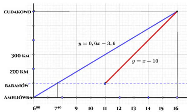 Odpowiedź: pociąg osobowy z Ameliówki wyjeżdża o 6.00 i jadąc z prędkością 60 km/h, jest o 7.40 w Burakowie w B. Pospieszny wyjeżdża z Burakowa dopiero o 11 i jedzie z prędkością 100 km/h. Obydwa przyjeżdżają do C o 16.00. Wykres pokazano na rysunku 2.