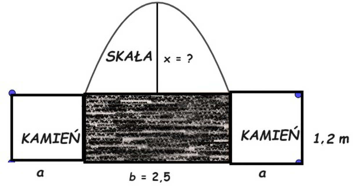 W pokładzie węgla grubości 1,2 m drążymy chodnik szerokości b=2,5 metra z przybierką stropu w kształcie sklepienia. Jaka musi być strzałka sklepienia, aby kamienia wystarczyło na ułożenie pasów posadzkowych obok chodnika? Stosunek szerokości a pasa posadzkowego do szerokości b chodnika jest 2:3, współczynnik rozluzowania skały jest równy 2. Wskazówka. Sklepienie w górotworze przybiera kształt paraboliczny (teoria Protodiakonowa). Pole przekroju sklepienia obliczymy ze wzoru