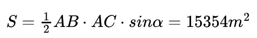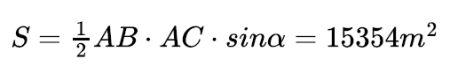 Mogę jednak spróbować rozwiązać, nie rozumiejąc. Mamy trójkąt ABC, w którym znamy długości dwóch boków i kąt. Który kąt? Z kontekstu wynika, że jest to kąt między AB i AC. To klasyczne zadanie trygonometryczne „tamtych” lat: „rozwiązać trójkąt” – czyli mając trzy jego elementy, wyznaczyć pozostałe trzy (kąty i boki). Potrzebne były tablice – wyznaczenie sinusa kąta podanego z dokładnością do minuty wymagało biegłości w posługiwaniu się nimi. Długość boku BC wyznaczamy z „uogólnionego wzoru Pitagorasa”, twierdzenia cosinusów. Pole trójkąta ABC obliczymy ze wzoru