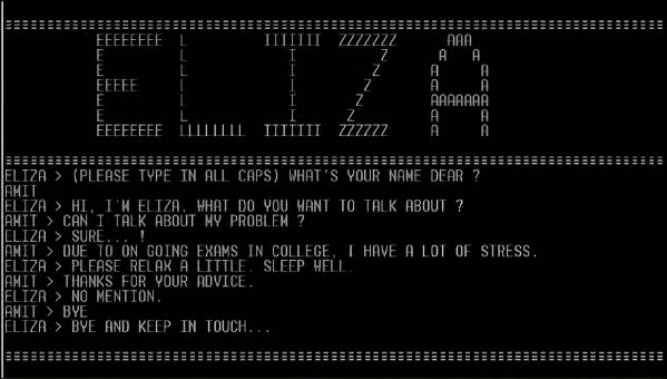 1966 Bot konwersacyjny ELIZA (1) został zaprojektowany przez Josepha Weizenbauma, jako program symulujący (lub zdaniem niektórych parodiujący) psychoanalityka w implementacji znanej jako DOCTOR, w której działa jak psychoterapeuta, odpowiadając na wypowiedzi pacjenta poprzez wybranie frazy od respondenta i powtórzenie jej w formie pytania. Jednak odpowiedzi chatbota DOCTOR szybko stawały się niespójne. Narzędzie okrzyknięto „inteligentnym” chatbotem, ponieważ potrafiła zachować ciągłość konwersacji, interpretując dane wejściowe wprowadzone przez użytkownika. Była pierwszym chatbotem, który podjął próbę pokonania testu Turinga. Była oparta na regułach, które programista ustanawiał w predefiniowanym skrypcie.