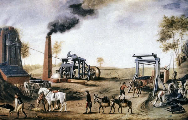1698–1769 Thomas Savery patentuje pierwszą praktyczną maszynę parową jeszcze pod koniec XVII wieku. Kilkanaście lat później Thomas Newcomen udoskonala ją, zwiększając jej wydajność. Jednak dopiero ostry start rewolucji przemysłowej w Wielkiej Brytanii, który datuje się na połowę XVIII wieku, sprawił, że węgiel, a później ropa naftowa i gaz ziemny stały się kluczowymi źródłami energii dla przemysłu i gospodarstw domowych w Wielkiej Brytanii i za granicą. W 1760 roku, węgiel zaspokajał tam dwie trzecie wszystkich potrzeb energetycznych. W 1769 roku James Watt patentuje ulepszoną maszynę parową zasilaną spalanym węglem. Silnik parowy stworzony przez Jamesa Watta stał się główną siłą napędową rewolucji przemysłowej (3).