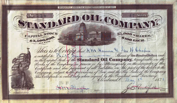 1863 John D. Rockefeller zakłada Standard Oil Company, która pod koniec XIX wieku kontrolowała 80 proc. rynku paliw w USA (10). W 1911 r., w następstwie procesów antymonopolowych i nakazów sądu federalnego, Standard Oil została podzielona na 34 odrębne firmy.