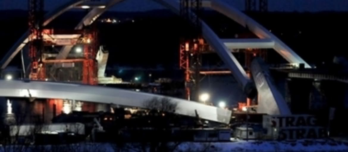 Teraz łukiem zajmują się spawacze. Konstrukcja będzie łączona od środka i od zewnątrz. Drugi, południowy łuk mostu, wypłynie z tymczasowych doków za miesiąc. Obecnie jest przygotowywany do połączenia i transportu.