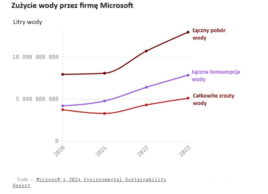 Katalog problemów, jaki nomen omen generuje nowa fala AI, nie byłby kompletny bez wzmianki o ogromnym wzroście zużycia energii w centrach obliczeniowych (1). Eksperci szacują, że każde zapytanie skierowane do AI zużywa kilkadziesiąt razy więcej energii niż pojedyncze wyszukiwanie w Google. Niedawne badanie wykazało, że integracja sztucznej inteligencji z wyszukiwarką Google spowodowałaby, że samo tylko Google zużywałoby więcej energii niż cała Chorwacja. A całość usług AI do 2026 r. wygeneruje zapotrzebowanie na energię równoważne zużyciu energii elektrycznej przez całą populację Holandii. Oprócz wysokiego poziomu zużycia energii, centra danych, które szkolą i obsługują działanie generatywnych modeli sztucznej inteligencji, zużywają miliony litrów wody (2). Naukowcy szacują, że przeciętna sesja z chatbotem (od 10 do 50 wymian wiadomości) zużywa pół litra wody. Już teraz zdarzą się niedobory wody na te potrzeby. W Altoona w stanie Iowa odkryto, że centrum danych zużywało jedną piątą wody zużywanej przez całe miasto, gdy akurat trwała susza. Przy czym model wykorzystywania jej na potrzeby chłodzenia maszyn znacząco różni się od ludzkiego modelu używania wody. Kiedy pobieramy wodę z wodociągu a następnie natychmiast odprowadzamy ją z powrotem do kanalizacji, po prostu woda przepływa dalej, choć w stanie zanieczyszczonym. Centrum danych pobiera wodę i odparowuje ją w wymiennikach, co oznacza, że wraca ona do gruntu dopiero po roku.