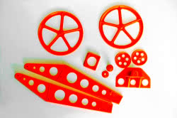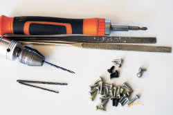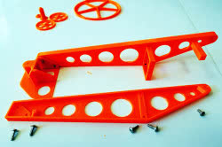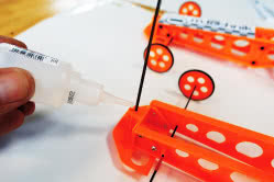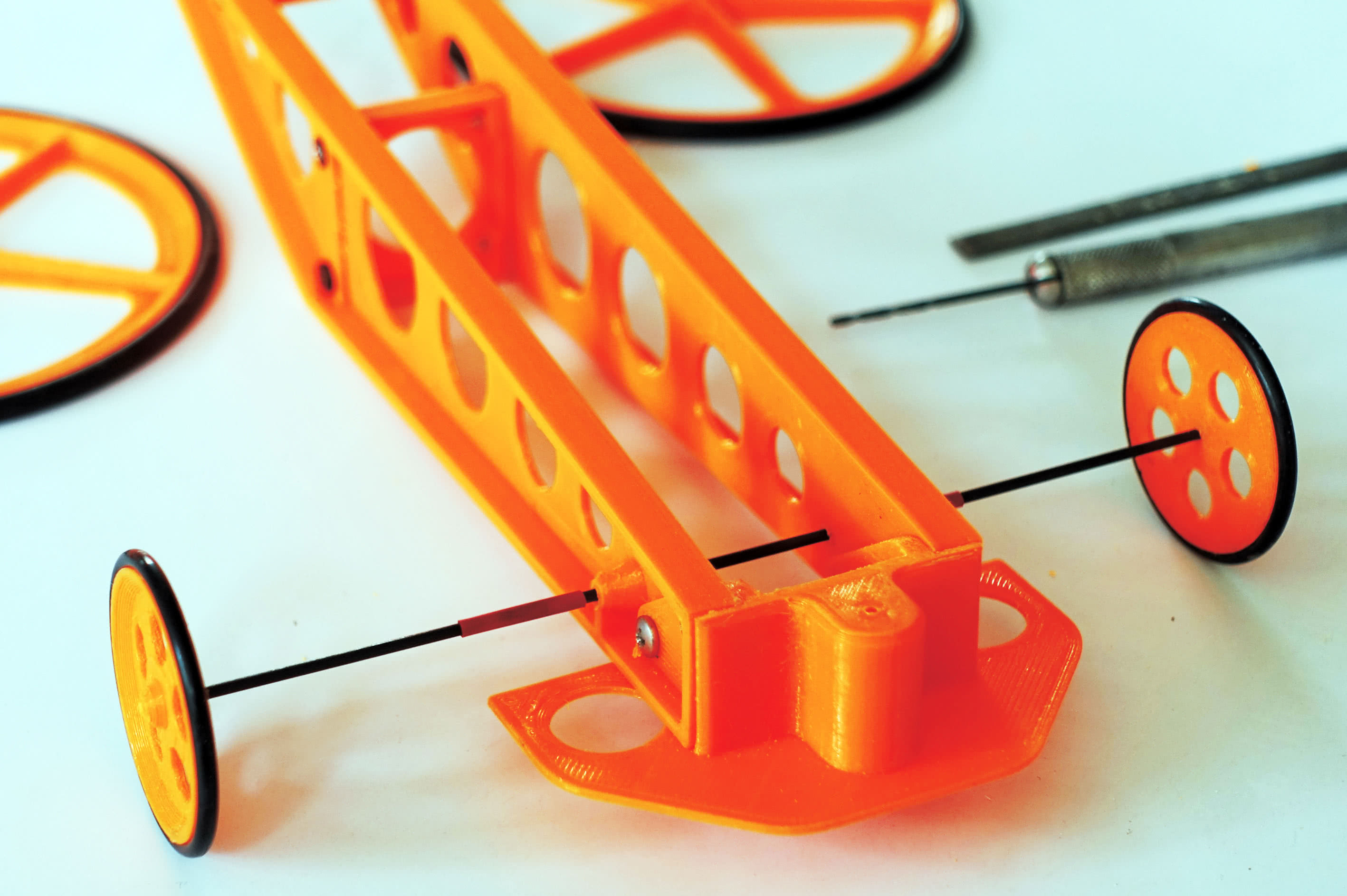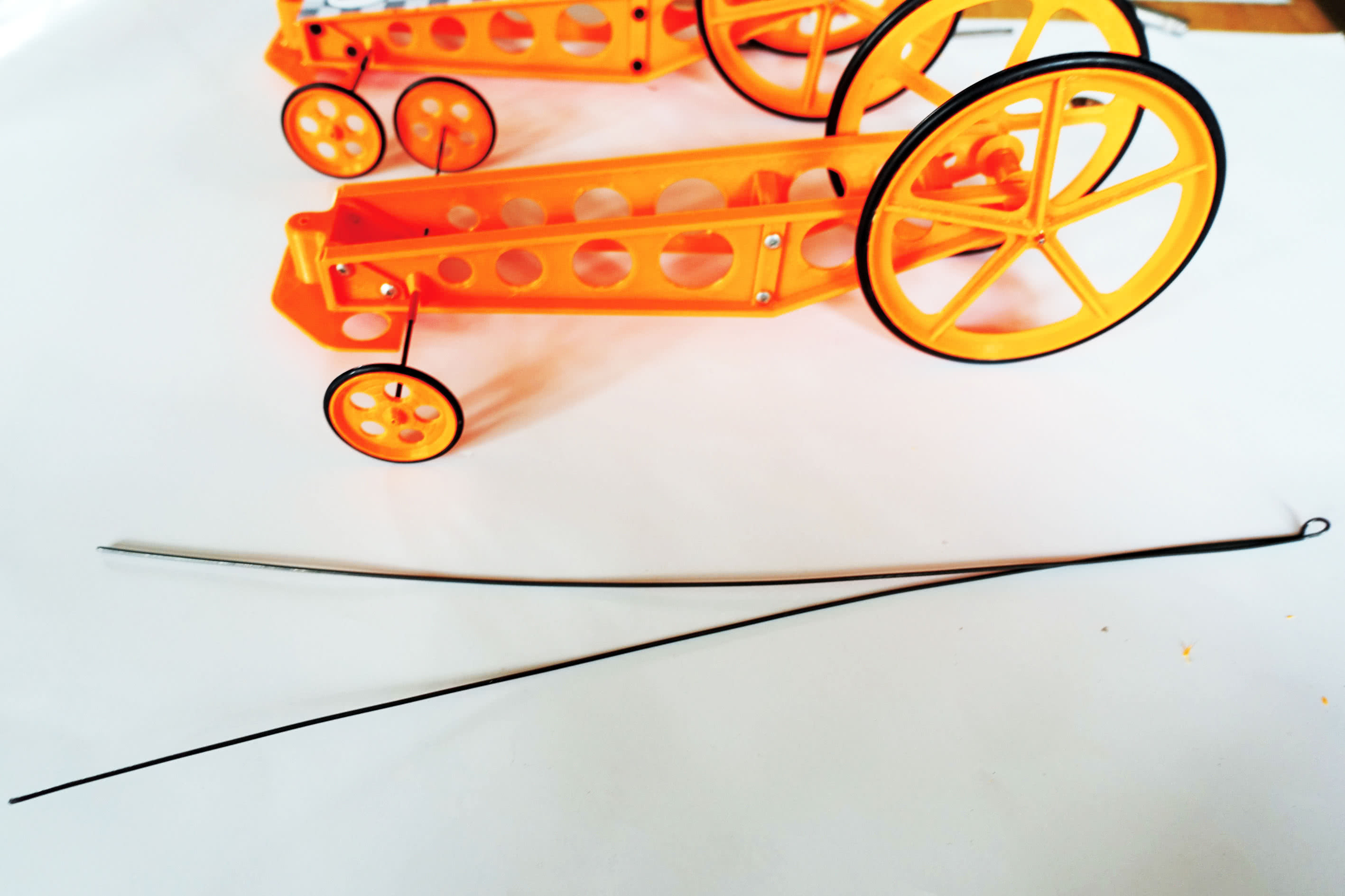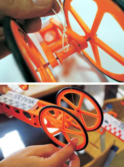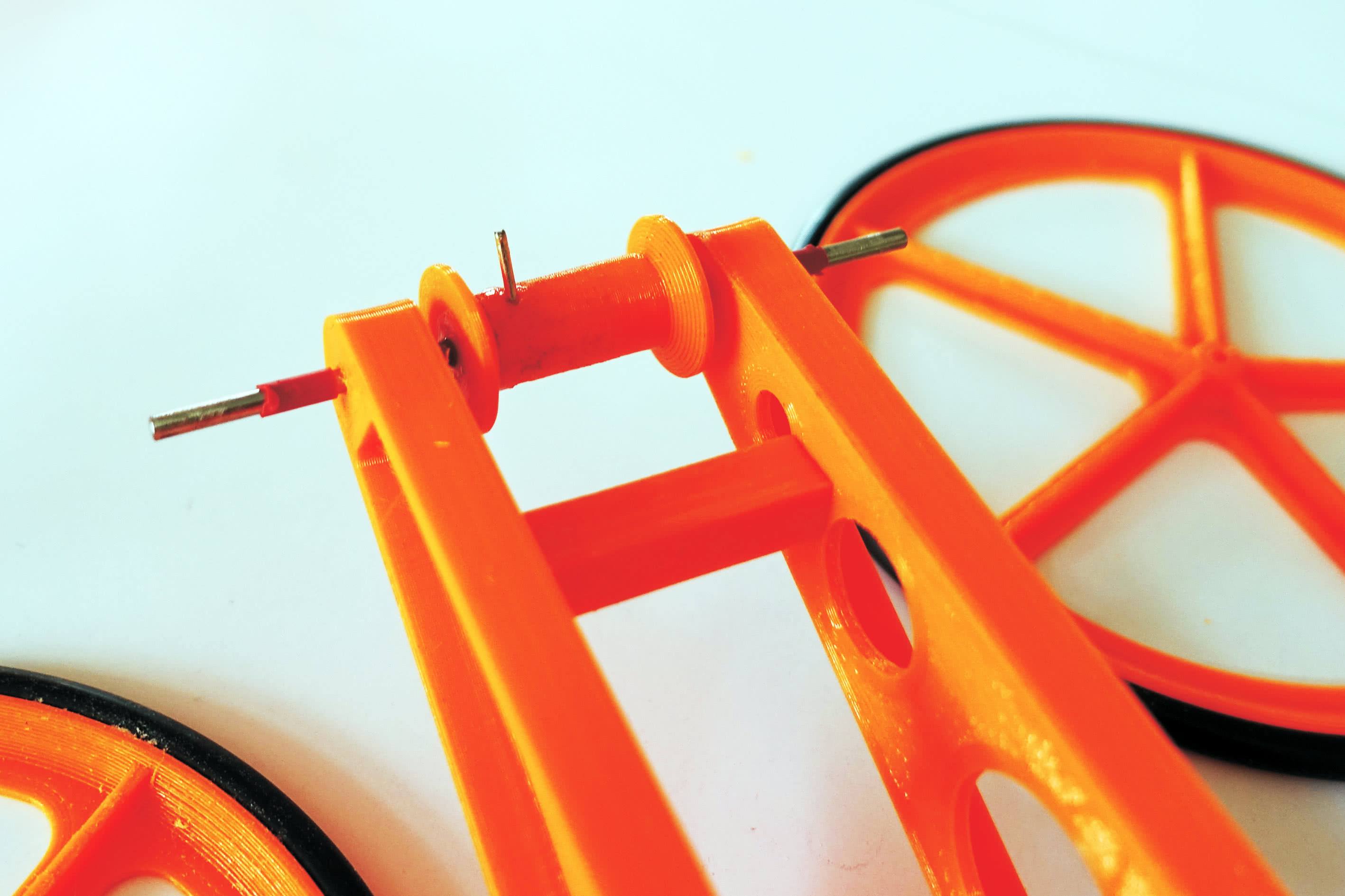 Otwory w ramie na osie kół oraz otwory w kołach należy rozwiercić do wymaganej średnicy, w wydrukach są tylko otwory pilotujące, do wiercenia nie należy używać wiertarek szybkoobrotowych, najlepiej rozwiercać ręcznie, używając wiertła zamocowanego w uchwycie. Ramę skręcamy za pomocą wkrętów do tworzyw sztucznych, trudno je będzie zakupić, ale można je odzyskać ze zużytych zabawek czy plastikowych obudów elektroniki, ostatecznie można zastosować małe wkręty do drewna lub śrubki 3 mm. Przednią oś należy wykonać z drutu stalowego o średnicy 0,8…1,5 mm i długości 14…16 cm. Tylną oś wykonamy z drutu 1,5…2 mm, jej długość to 7 cm. Otwory w kołach i szpulce napędowej rozwiercamy tak, żeby pasowały na wcisk, natomiast otwory w ramie muszą zapewnić swobodny obrót osi kół. Przednią oś zabezpieczmy przed przesuwaniem dwoma odcinkami rurki termokurczliwej, natomiast koła i szpulkę przyklejamy kropelkami kleju cyjanoakrylowego.