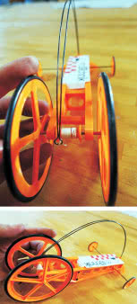 Jako napęd modelu zastosowano element sprężysty, analogicznie jak w łuku lub kuszy, z tym że w naszym przypadku naprężona cięciwa nie wystrzeliwuje strzały, a rozwija się ze szpulki, napędzając koła modelu. Od zastosowanej sprężyny będą zależeć osiągi modelu, sprężyna napędowa w moim przypadku wykonana jest z dwu drutów stalowych („fortepianowych”) o średnicy 1,2 mm i długości 30…35 cm. Można ją wykonać też z pojedynczego drutu o średnicy 1,5 mm lub pręcika z włókna szklanego o średnicy 2 mm, wykonanie tego elementu pozostawiam Waszej pomysłowości i kreatywności. Sprężynę należy zamontować w otworze znajdującym się z przodu modelu, wcześniej go rozwiercając tak, żeby uzyskać pasowanie na wcisk i zabezpieczyć klejem, do górnego końca sprężyny przywiązujemy mocną nitkę zakończoną pętelką, którą założymy na zaczep szpulki napędowej, następnie naciągamy sprężynę, kręcąc tylnymi kołami. Model stawiamy na podłodze i puszczamy. Napęd poprawnie wykonanego modelu powinien wystarczyć na przejechanie około czterech metrów, dalszą część dystansu model pokonuje, jadąc siłą bezwładności.