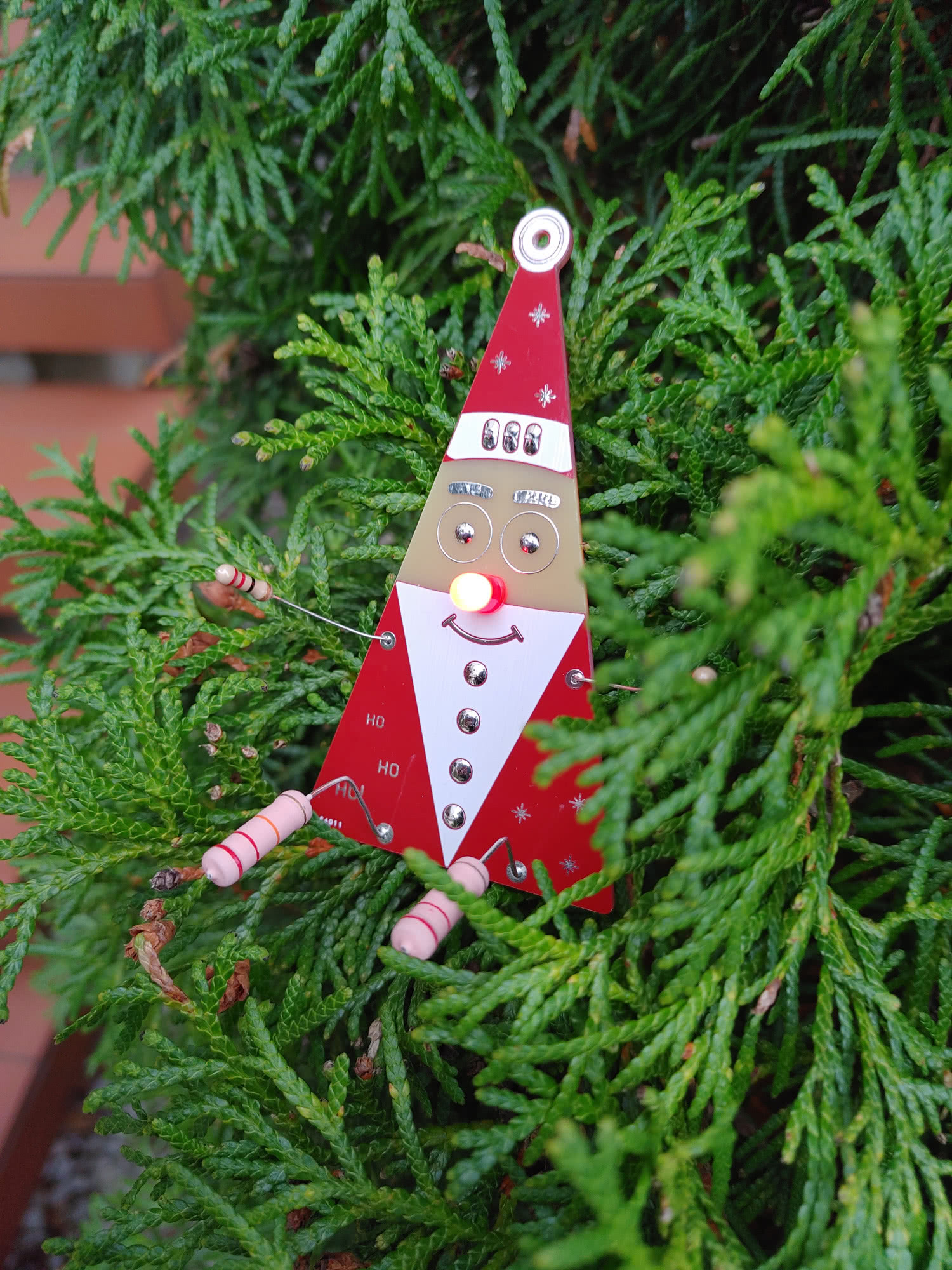 Zmontowana postać Świętego Mikołaja może być oryginalną ozdobą choinki dzięki otworowi do przełożenia „drucika” lub nitki znajdującemu się w pomponie czapki. Odpowiednie wygięcie rezystorów nóg pozwoli Mikołajowi samodzielnie siedzieć, a nawet stać na naszym biurku czy świątecznym stole.